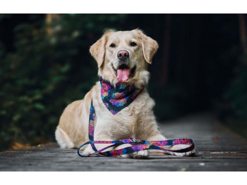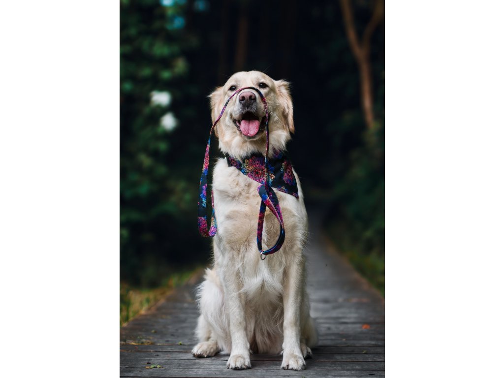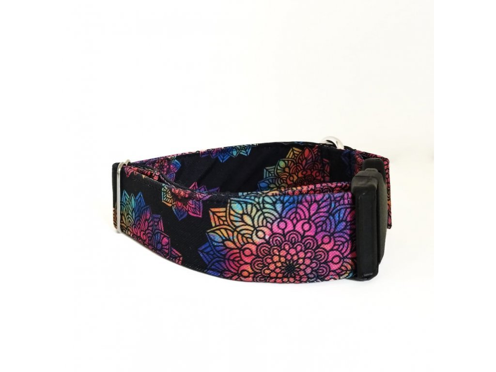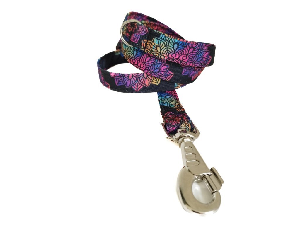 Obojek a vodítko s černým podkladem na kterém vynikají barevné mandaly. Obojek můžete doplnit o další naše produkty ve stejně krásných barvách.